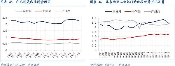 马来西亚和泰国有一定工业能力,由于其工业产成品的RCA指数同原材料相差不大,且不具备稳步提升的趋势,显然还不具备显著的工业产成品比较优势。