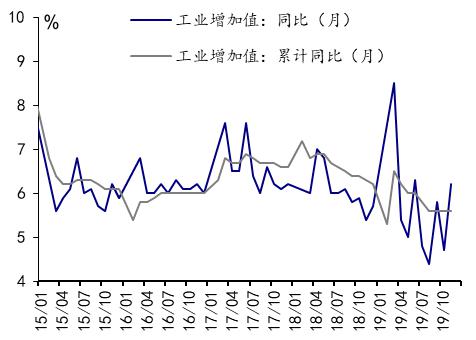工业增加值增速反弹超预期。11月份,规模以上工业增加值同比实际增长6.2%,比10月份加快1.5个百分点。从环比看,11月份,规模以上工业增加值比上月增长0.78%。1-11月份,规模以上工业增加值同比增长5.6%。11月工业生产增速回升,出口交货值降幅收窄,中国制造业采购经理指数(PMI)重返扩张区间,生产指数和新订单指数达到下半年以来高点,制造业景气度出现回升。但由于去年11月份工业增速为全年最低点,今年同期生产回升有一定的基数因素影响。