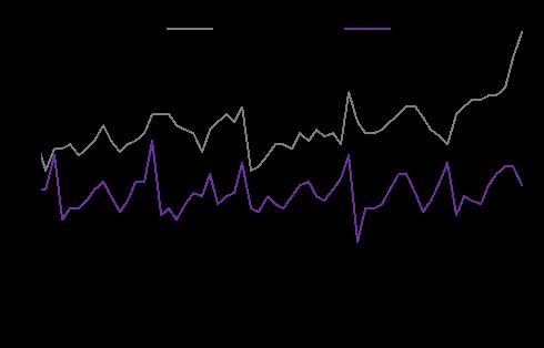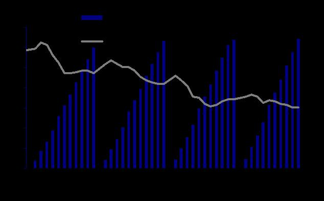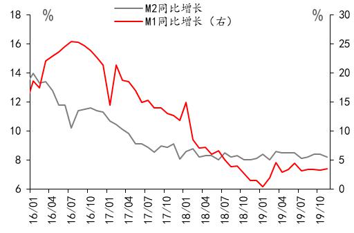 M2增速回落,M1增速回升。11月M2同比增速8.2%,较上月下滑0.2个百分点,或与财政存款少减有关,11月财政存款减少2451亿元。而M1同比回升0.2个百分点至3.5%,一方面是因地产销售回暖导致居民存款向企业部门转移,另一方面或是受企业信贷和表外融资多增影响。