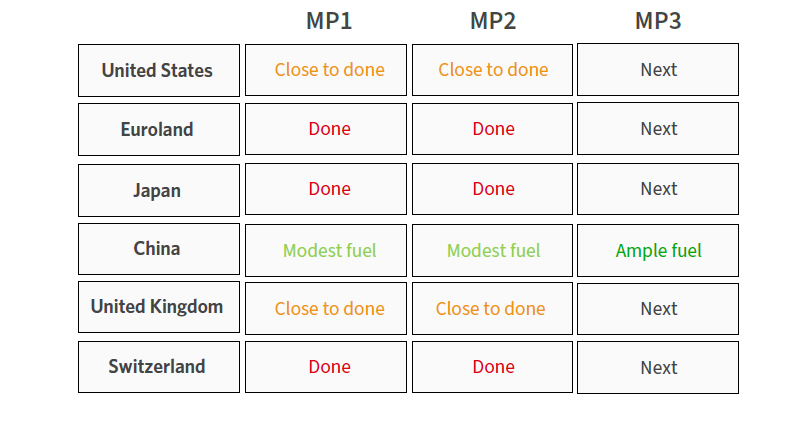 • Over time, we’d expect to see a march toward expansionary fiscal policy nearly everywhere. We expect policy makers will need to shift to what we’ve been discussing for a long time—what we call “Monetary Policy 3”—which is essentially coordinated monetary and fiscal policy aimed directly at supporting spending, with central banks monetizing fiscal deficits. This is likely whether from the right (through higher military spending or lower taxes) or from the left (through more direct spending on infrastructure or social programs). So far, there has been a palpable shift in the policy conversation in favor of more fiscal easing, but much less action. While political obstacles may slow it down in the near term (in particular, the divided government in the US), the trajectory seems clear.