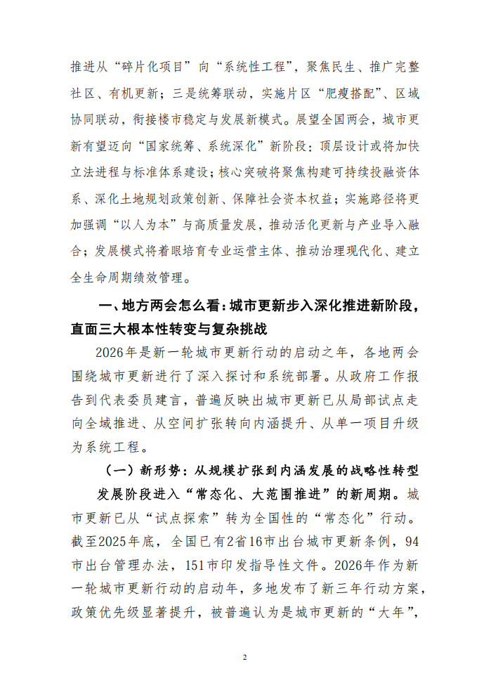 一、地方两会怎么看:城市更新步入深化推进新阶段,直面三大根本性转变与复杂挑战