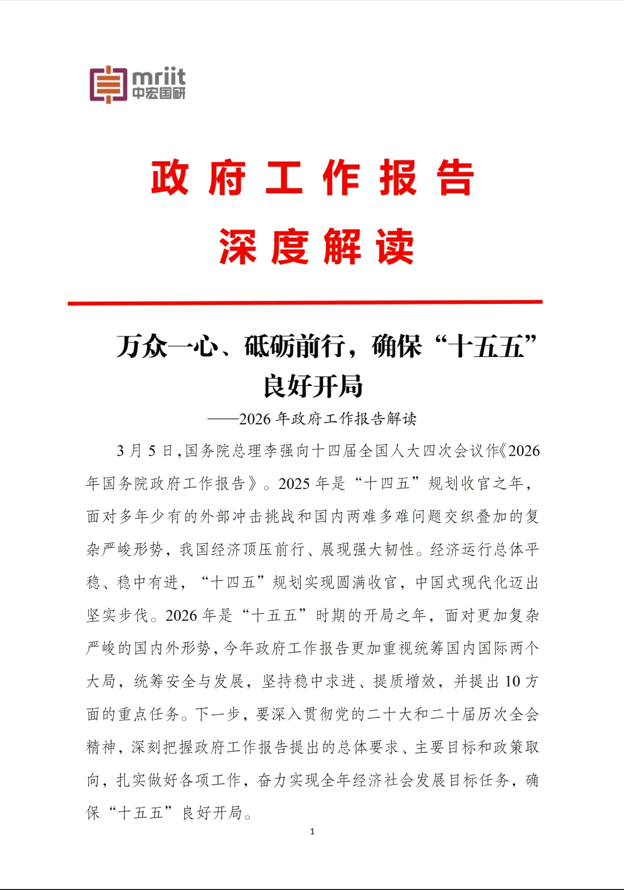 2026年是“十五五”规划的开局之年,也是我国加快构建新发展格局、着力建设强大国内市场的关键之年。3月5日,国务院总理李强代表国务院向十四届全国人大四次会议作《政府工作报告》,全面定调了全年及未来五年的宏观经济、产业发展、改革开放、民生保障等核心方向,是所有市场主体制定发展战略、把握政策机遇的核心纲领。为帮助各企事业单位、金融机构、研究机构精准把握政策内涵、吃透发展红利、规避潜在风险,我院推出了《政府工作报告深度解读》,本报告深度拆解政府工作报告核心要义,系统复盘 “十四五” 收官阶段经济发展成果,精准研判 “十五五” 开局之年的宏观经济走势、重点产业扶持方向、区域发展机遇、改革攻坚重点,为企事业单位的经营决策、投资布局、战略规划提供决策参考。诚邀订阅 联系人:张老师 18618293457(同微信)