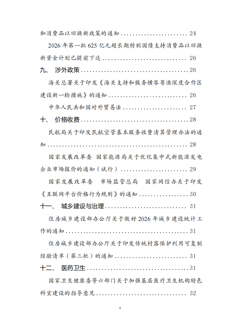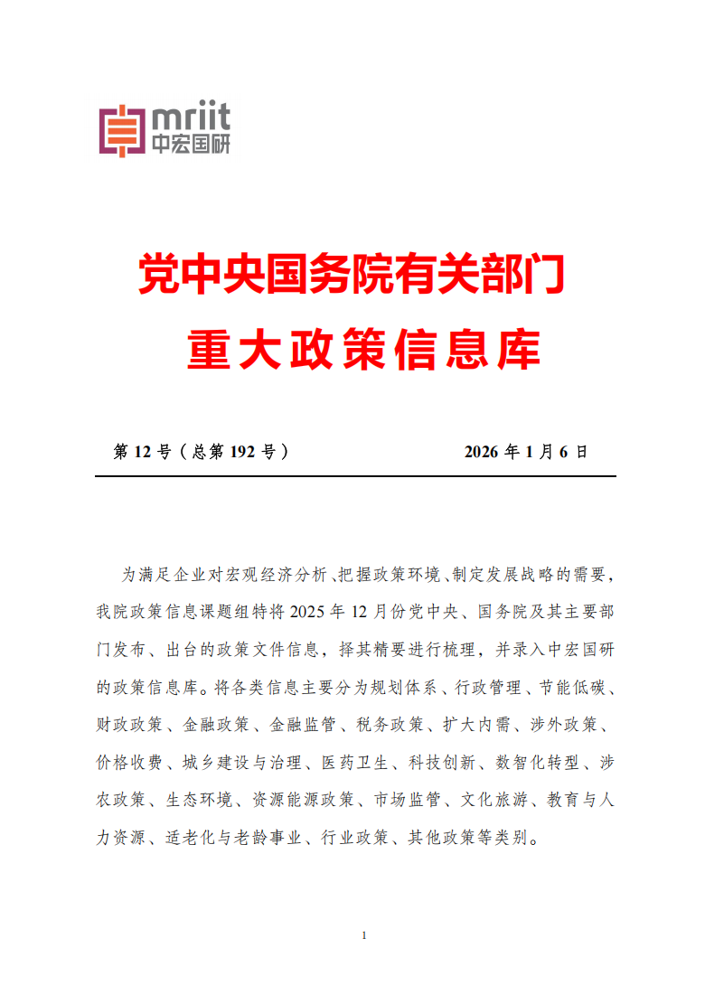 政策信息课题组特将2025年12月份党中央、国务院及其主要部门发布、出台的政策文件信息,择其精要进行梳理,并录入中宏国研的政策信息库。将各类信息主要分为规划体系、行政管理、节能低碳、财政政策、金融政策、金融监管、税务政策、扩大内需、涉外政策、价格收费、城乡建设与治理、医药卫生、科技创新、数智化转型、涉农政策、生态环境、资源能源政策、市场监管、文化旅游、教育与人力资源、适老化与老龄事业、行业政策、其他政策等类别。