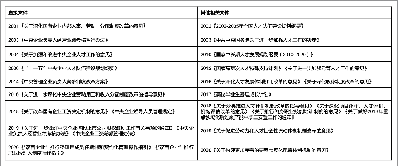 1.国企改革中人力资源相关的主要政策国家层面:从2001年人才强国成为国家战略开始,人力资源相关的改革就在不断推进。国家层面的改革主要包括全国各类人才队伍的统筹建设,公务员系统的职位体系及价值分配改革,事业单位的岗位管理体系及用人机制的改革,国企三项制度改革等,同时,国家重点优化人力资源的体制机制,尤其是市场化用人、人才培养、人才评价、人才流动等方面营造整体人才生态。2016年之后配合创新驱动发展的国家战略,重点在科研机构人才管理、科研人员创业激励等方面不断释放政策红利。