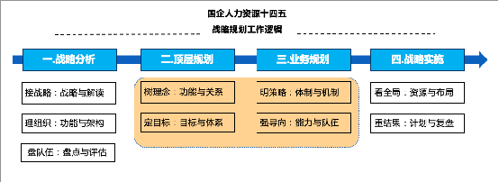 十四五期间,在一带一路国家战略带动下,在数字经济、产业互联网及高质量发展的引领还带动下,在新基建的投资带动下,国企会迎来新的一波发展高潮,对国企人力资源来讲,国企的整体发展一方面会对人力资源提出新需求,同时发展的大潮也可能会对部分攻坚性改革起到延滞作用,问题在发展中被忽略或搁置。在对国企改革和国企人力资源现状的深度战略认知基础上,不同国企结合自身的特点对共性问题和特性问题提出自己独有的人力资源十四五规划方案。人力资源十四五规划可以采用战略分析、顶层规划、业务规划、战略实施的整体逻辑进行展开。